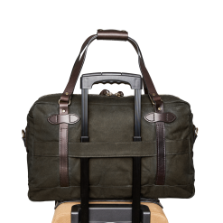 With a 34-liter capacity. our 48 Hour Duffle Bag is ideally sized for a long weekend. It is made from our waxed Tin Cloth. the iconic canvas that’s withstood the elements in rain-soaked backlands for a century. The main compartment is fully lined with unwaxed cotton to protect clothing and gear. The Bridle Leather handles are thick and strong for lasting service. Exterior zippered pockets keep quick-access essentials close at hand. The trolley strap on the back slides over the handles of rolling luggage for ease in navigating airport security. This bag meets airline carry-on size requirements. but if you do check it. the shoulder strap detaches to avoid snagging.