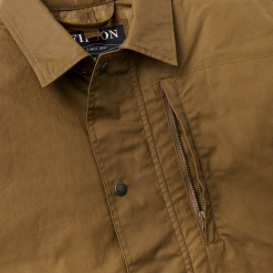Based on a Filson archival style. our water-resistant Aberdeen Work Jacket is built with our lightest oil finish cotton for year-round comfort and foul-weather protection. The body is lined with unwaxed cotton and the sleeves with slick polyester for easy layering. Rib-knit cuffs and a drawcord-adjustable hem seal out the wind. Equipped with a zippered chest pocket and snap-flap cargo pockets with hidden Moleskin-lined hand pockets.