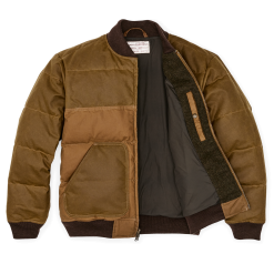The Down Bomber Jacket pairs our signature waxed cottons with 650-fill-power down for heavy-duty warmth that weighs little. The torso is constructed from 8-oz. water-resistant oil finish Cover Cloth. with waxed 11-oz. Shelter Cloth for the shoulders and sleeves for increased durability and weather protection. The patch pockets are made from oil finish Shelter Cloth and lined with 100% wool for warmth. The classic bomber design features sturdy wool-blend ribbed cuffs and hem to keep warmth in and seal out cold wind.