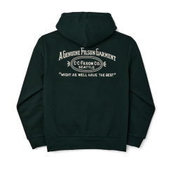 Our Prospector Embroidered Hoodie is a warm and durable classic. featuring. direct-embroidered Filson logo graphics on front and back. With a lofted interior and smooth. pilling-resistant exterior face. the sturdy 13-oz. fleece holds its structure over years of wear. Rib-knit hem and cuffs. Drawcord-adjustable hood. Kangaroo center pocket.