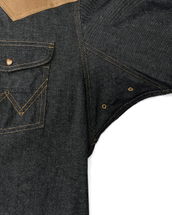 A durable special-edition shirt made from 7.3-oz. denim with a right-hand twist. Denim’s legendary dependability and comfort on ranches. jobsites. and Naval ships has made it a favorite fabric for work and daily wear. The shoulders are made from a washable waxed canvas that adds durability and a bit of water resistance if caught in a shower without a jacket. The back yoke is vented for breathability. and the front is pointed for Western flair. Antiqued bronze snaps secure the front. pocket flaps and cuffs. Forearms are reinforced with the same washable waxed canvas as the yoke. Wrangler’s signature ‘W’ is embroidered on the front pockets.