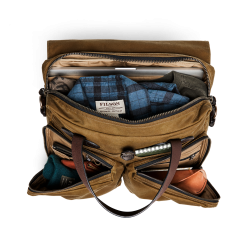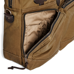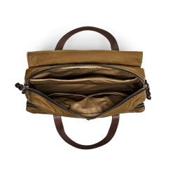 Our highest-capacity briefcase. the 24-Hour Briefcase combines the organizing ability of our Padded Computer Bag with the sleek design of our Original Briefcase. The waxed Tin Cloth material protects gear from foul weather and spray. This tightly woven canvas duck has been thoroughly saturated with wax for water resistance. The Bridle Leather handles are vegetable-tanned with tallows and wax added in the final stages. giving the leather a deep luster and lasting flexibility. The main zipper is solid brass from YKK® for a lifetime of rust-free operation. The interior is fully lined with unwaxed cotton. with a padded sleeve for laptops up to 15‚Äù. Exterior zippered pockets have organization pockets inside. Rear trolley strap slides over luggage handles. Detachable. adjustable webbing shoulder strap.