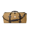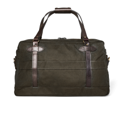 With a 34-liter capacity. our 48 Hour Duffle Bag is ideally sized for a long weekend. It is made from our waxed Tin Cloth. the iconic canvas that’s withstood the elements in rain-soaked backlands for a century. The main compartment is fully lined with unwaxed cotton to protect clothing and gear. The Bridle Leather handles are thick and strong for lasting service. Exterior zippered pockets keep quick-access essentials close at hand. The trolley strap on the back slides over the handles of rolling luggage for ease in navigating airport security. This bag meets airline carry-on size requirements. but if you do check it. the shoulder strap detaches to avoid snagging.