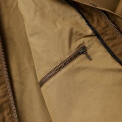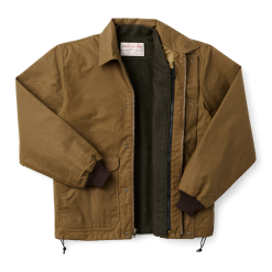 Based on a Filson archival style. our water-resistant Aberdeen Work Jacket is built with our lightest oil finish cotton for year-round comfort and foul-weather protection. The body is lined with unwaxed cotton and the sleeves with slick polyester for easy layering. Rib-knit cuffs and a drawcord-adjustable hem seal out the wind. Equipped with a zippered chest pocket and snap-flap cargo pockets with hidden Moleskin-lined hand pockets.