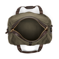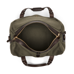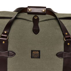 Our Rugged Twill Duffle Bags embody the philosophy that’s guided Filson since 1897. making products that are handed down rather than tossed out. Made with our signature Rugged Twill and Bridle Leather. our Medium Duffle Bag is built tough enough for the most extreme excursions and sized for long weekends and multi-day trips. The lightly waxed fabric keeps gear dry and closes with a solid brass YKK® zipper that’s protected by a snap-secured storm flap. We use Bridle Leather from Wickett & Craig for the removable shoulder strap and for the handles that wrap around the bag to securely cradle heavy loads. Interior end-cap pockets for organization.