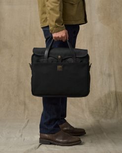 Made with our iconic Rugged Twill and Bridle Leather. the Filson Original Briefcase is built to survive any workplace. whether on land. at sea. or in the air. The lightly waxed fabric sheds water and withstands abrasion. year after year. The handles and detachable. adjustable shoulder strap are built with the same Bridle Leather that’s used for making horse tack. The roomy interior has organizational dividers and space for a 15 laptop and secures with a YKK solid brass zipper protected by a storm flap. A testament to our signature fabric’s durability. one customer recorded over one million miles of travel with his Original Briefcase.