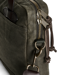 Our Tin Cloth Compact Briefcase is padded to protect a laptop or tablet up to 15. The front stow pocket extends the full width of the briefcase for carrying files. and the rear pocket snaps closed to secure contents. The main compartment’s heavy-gauge metal YKK zipper is built for a lifetime of service. The fabric is our signature Tin Cloth. a tightly woven duck canvas that’s been thoroughly saturated with liquefied wax under heat and pressure for maximum water resistance. Tin Cloth’s tight weave provides outstanding resistance to abrasion and punctures without excessive weight. The Bridle Leather handles are thick and strong for lasting service.. The interior is fully lined with cotton Cover Cloth. Detachable. adjustable webbing shoulder strap.