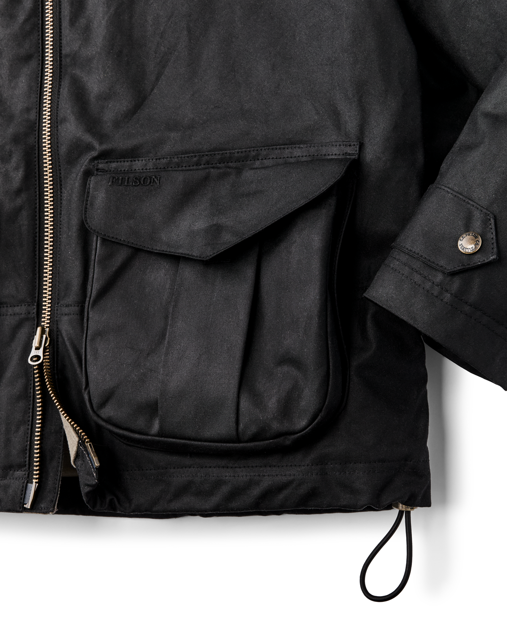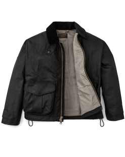 This jacket is an instant favorite whether tackling chores. exercising the dog. or running about. It’s made with our signature oil finish Shelter Cloth from England’s historic British Millerain. a pioneer of waxed canvas. In a nod to tradition. the caped shoulder construction eliminates exposed seams for improved water resistance. Large expandable cargo pockets carry the essentials and feature hidden hand pockets. The entire jacket is lined with warm brushed-cotton flannel. The drawcord-adjustable hem is a detail retained from the original.